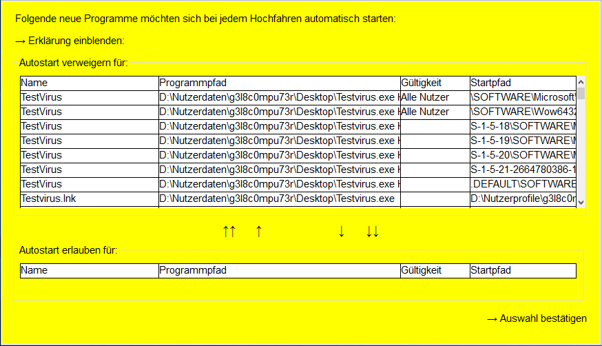 *Der Testvirus prüft alle Starteinträge, über die sich Schadsoftware aktivieren und reaktivieren kann. Er kann in den Sicherheitsstufen „normaler Nutzer“ und „Administrator“ getestet werden. Der „Virus“ sammelt oder löscht keinerlei Daten. Er zeigt lediglich alle ungeschützten Orte an und erinnert mit jedem Neustart an diese, bis er deinstalliert wurde. Dies simuliert das Startverhalten eines echten Virus, der sich ebenfalls mit jedem Neustart reaktivieren kann.